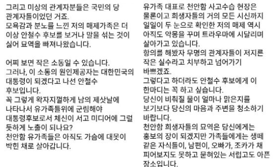 현충원을 찾은 천안함 희생장병 유가족이 ‘VIP’ 때문에 참배 도중 쫓겨났다는 사연이 올라왔다. 글쓴이가 말한 VIP는 안철수 국민의당 대선후보였다.